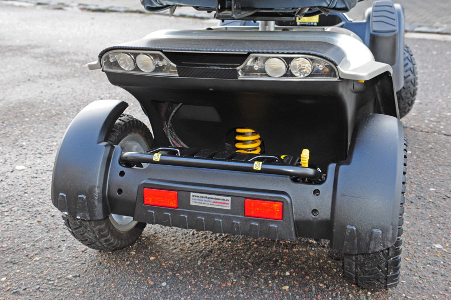 Maximální výbava, litá kola, McPerson, kotoučové brzdy, ukazatel stavu ACCU, brzdová světla, celkové odpružení - možnost nastavení tuhosti tlumičů, LED světla, klakson, neutrál, nákupní košík, držák na francouzské hole, reflexní vesta, automatická nabíječka |